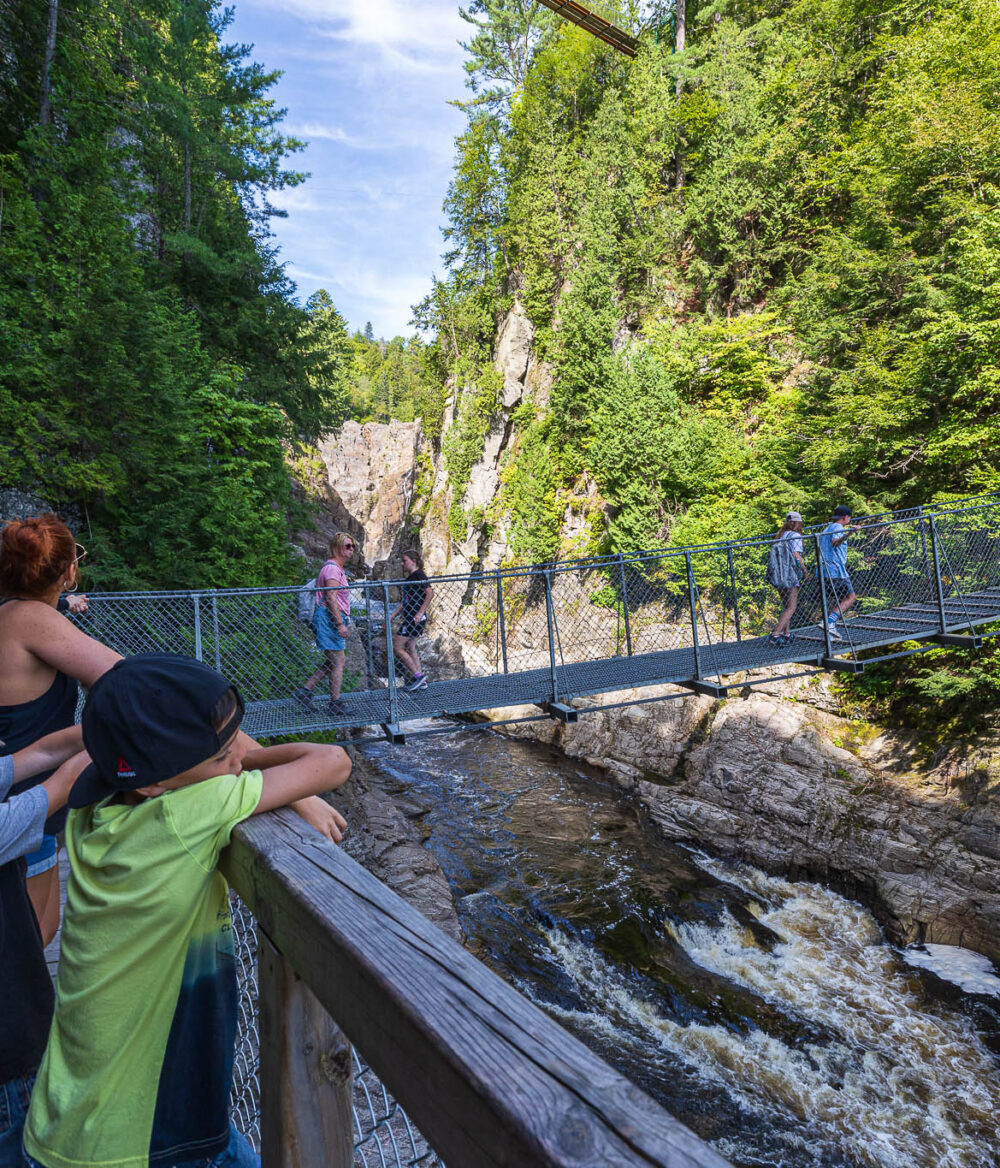 En famille, seul ou entre amis, vivez l’expérience d’une randonnée pédestre au cœur d’un véritable canyon creusé dans le roc du Bouclier canadien depuis plus d’un milliard d’années. Parcourez 3 km de sentiers balisés, traversez une chute de 74 mètres, plus haute que celle du Niagara, et empruntez trois ponts suspendus, dont l’un des plus hauts et spectaculaires du Québec, perché à 60 mètres au-dessus du canyon. Admirez les panoramas saisissants de la chute et des rochers depuis huit belvédères aménagés dans les parois rocheuses du canyon.