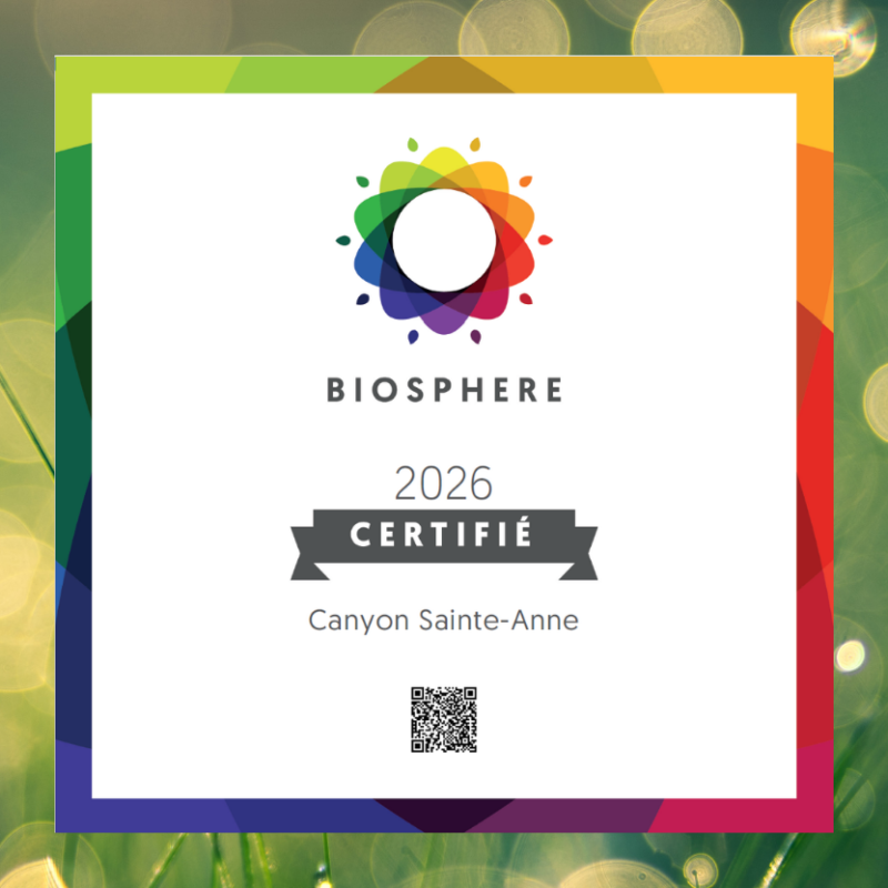 L'équipe du Canyon Sainte-Anne est très heureuse et fière d'annoncer que depuis novembre 2025, l'entreprise est officiellement certifiée Biosphère.